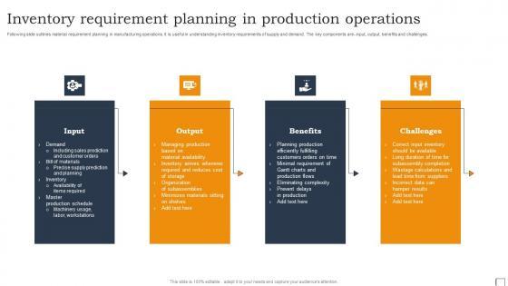Following slide outlines material requirement planning in manufacturing operations. It is useful in understanding inventory requirements of supply and demand. The key components are- input, output, benefits and challenges. Showcasing this set of slides titled Inventory Requirement Planning In Production Operations Pictures Pdf. The topics addressed in these templates are Input, Output, Benefits. All the content presented in this PPT design is completely editable. Download it and make adjustments in color, background, font etc. as per your unique business setting. Following slide outlines material requirement planning in manufacturing operations. It is useful in understanding inventory requirements of supply and demand. The key components are- input, output, benefits and challenges.