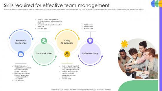 This slide mentions various skills required by managers for effective team management within the existing unit. Key skills include emotional intelligence, communication, ability to delegate and problem solving. Retrieve professionally designed Unlocking Potential Enhancing Skills Required For Effective Team Management to effectively convey your message and captivate your listeners. Save time by selecting pre-made slideshows that are appropriate for various topics, from business to educational purposes. These themes come in many different styles, from creative to corporate, and all of them are easily adjustable and can be edited quickly. Access them as PowerPoint templates or as Google Slides themes. You do not have to go on a hunt for the perfect presentation because Slidegeeks got you covered from everywhere. This slide mentions various skills required by managers for effective team management within the existing unit. Key skills include emotional intelligence, communication, ability to delegate and problem solving.