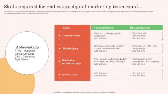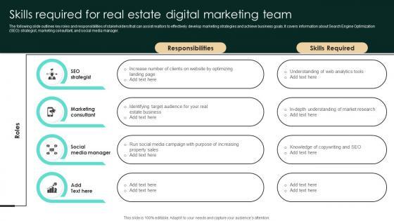 The following slide outlines key roles and responsibilities of stakeholders that can assist realtors to effectively develop marketing strategies and achieve business goals. It covers information about Search Engine Optimization SEO strategist, marketing consultant, and social media manager.Coming up with a presentation necessitates that the majority of the effort goes into the content and the message you intend to convey. The visuals of a PowerPoint presentation can only be effective if it supplements and supports the story that is being told. Keeping this in mind our experts created Skills Required For Real Estate Digital Marketing Team Real Estate Property Marketing Mockup Pdf to reduce the time that goes into designing the presentation. This way, you can concentrate on the message while our designers take care of providing you with the right template for the situation. The following slide outlines key roles and responsibilities of stakeholders that can assist realtors to effectively develop marketing strategies and achieve business goals. It covers information about Search Engine Optimization SEO strategist, marketing consultant, and social media manager.