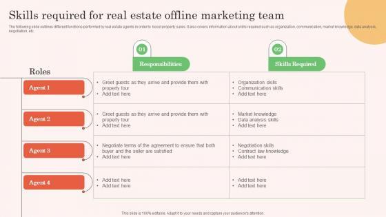 The following slide outlines different functions performed by real estate agents in order to boost property sales. It also covers information about skills required such as organization, communication, market knowledge, data analysis, negotiation, etc.This modern and well-arranged Skills Required For Real Estate Offline Marketing Team Real Estate Property Marketing Slides Pdf provides lots of creative possibilities. It is very simple to customize and edit with the Powerpoint Software. Just drag and drop your pictures into the shapes. All facets of this template can be edited with Powerpoint no extra software is necessary. Add your own material, put your images in the places assigned for them, adjust the colors, and then you can show your slides to the world, with an animated slide included. The following slide outlines different functions performed by real estate agents in order to boost property sales. It also covers information about skills required such as organization, communication, market knowledge, data analysis, negotiation, etc.