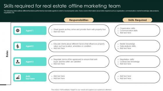 The following slide outlines different functions performed by real estate agents in order to boost property sales. It also covers information about skills required such as organization, communication, market knowledge, data analysis, negotiation, etc. Create an editable Skills Required For Real Estate Offline Marketing Team Download PDF that communicates your idea and engages your audience. Whether you are presenting a business or an educational presentation, pre-designed presentation templates help save time. Skills Required For Real Estate Offline Marketing Team Download PDF is highly customizable and very easy to edit, covering many different styles from creative to business presentations. Slidegeeks has creative team members who have crafted amazing templates. So, go and get them without any delay.