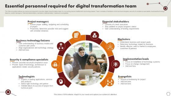 The following slide outlines key personnel required to develop digital transformation team for converting insurer traditional to technology based. Team consists of members which are technologists, security and compliance specialists, business or technology liaisons, project managers, financial stakeholders, marketers, implementation leads and evangelists. The best PPT templates are a great way to save time, energy, and resources. Slidegeeks have 100 percent editable powerpoint slides making them incredibly versatile. With these quality presentation templates, you can create a captivating and memorable presentation by combining visually appealing slides and effectively communicating your message. Download Technology Trends In Online Insurance Essential Personnel Required For Digital Transformation Team from Slidegeeks and deliver a wonderful presentation. The following slide outlines key personnel required to develop digital transformation team for converting insurer traditional to technology based. Team consists of members which are technologists, security and compliance specialists, business or technology liaisons, project managers, financial stakeholders, marketers, implementation leads and evangelists.