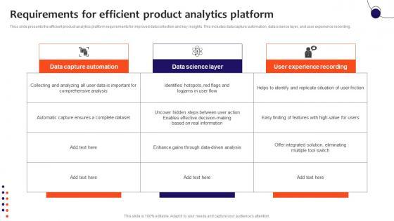 Thus slide presents the efficient product analytics platform requirements for improved data collection and key insights. This includes data capture automation, data science layer, and user experience recording. Pitch your topic with ease and precision using this Requirements For Efficient Product Analytics Platform Guidelines Pdf. This layout presents information on Comprehensive Analysis, Data Driven Analysis, Information. It is also available for immediate download and adjustment. So, changes can be made in the color, design, graphics or any other component to create a unique layout. Thus slide presents the efficient product analytics platform requirements for improved data collection and key insights. This includes data capture automation, data science layer, and user experience recording.