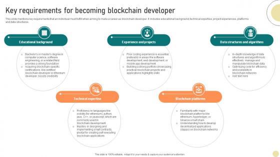 This slide mentions key requirements that an individual must fulfill when aiming to make a career as blockchain developer. It includes educational background, technical expertise, project experiences, platforms and data structures. Take your projects to the next level with our ultimate collection of Visionary Guide To Blockchain Key Requirements For Becoming Blockchain Developer BCT SS V. Slidegeeks has designed a range of layouts that are perfect for representing task or activity duration, keeping track of all your deadlines at a glance. Tailor these designs to your exact needs and give them a truly corporate look with your own brand colors they will make your projects stand out from the rest This slide mentions key requirements that an individual must fulfill when aiming to make a career as blockchain developer. It includes educational background, technical expertise, project experiences, platforms and data structures.
