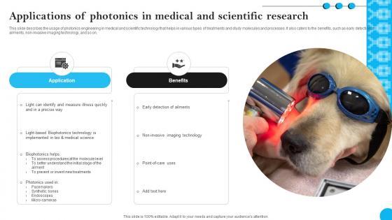 This slide describes the usage of photonics engineering in medical and scientific technology that helps in various types of treatments and study molecules and processes. It also caters to the benefits, such as early detection of ailments, non-invasive imaging technology, and so on. Present like a pro with Fibers IT Applications Of Photonics In Medical And Scientific Research. Create beautiful presentations together with your team, using our easy-to-use presentation slides. Share your ideas in real-time and make changes on the fly by downloading our templates. So whether you are in the office, on the go, or in a remote location, you can stay in sync with your team and present your ideas with confidence. With Slidegeeks presentation got a whole lot easier. Grab these presentations today. This slide describes the usage of photonics engineering in medical and scientific technology that helps in various types of treatments and study molecules and processes. It also caters to the benefits, such as early detection of ailments, non-invasive imaging technology, and so on.