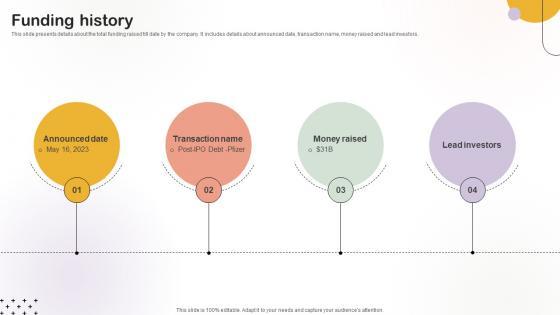 This slide presents details about the total funding raised till date by the company. It includes details about announced date, transaction name, money raised and lead investors.Slidegeeks is here to make your presentations a breeze with Funding History Medical Research Organization Pitch Deck With our easy-to-use and customizable templates, you can focus on delivering your ideas rather than worrying about formatting. With a variety of designs to choose from, you are sure to find one that suits your needs. And with animations and unique photos, illustrations, and fonts, you can make your presentation pop. So whether you are giving a sales pitch or presenting to the board, make sure to check out Slidegeeks first Our Funding History Medical Research Organization Pitch Deck are topically designed to provide an attractive backdrop to any subject. Use them to look like a presentation pro.
