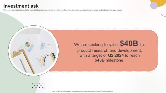This slide presents details about pharmaceutical business investment ask from the investors. It mentions the amount seeking to be raised, goal and target of investment ask.Whether you have daily or monthly meetings, a brilliant presentation is necessary. Investment Ask Medical Research Organization Pitch Deck can be your best option for delivering a presentation. Represent everything in detail using Investment Ask Medical Research Organization Pitch Deck and make yourself stand out in meetings. The template is versatile and follows a structure that will cater to your requirements. All the templates prepared by Slidegeeks are easy to download and edit. Our research experts have taken care of the corporate themes as well. So, give it a try and see the results. This slide presents details about pharmaceutical business investment ask from the investors. It mentions the amount seeking to be raised, goal and target of investment ask.