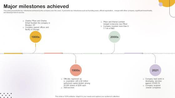 This slide presents the key milestones achieved by the company over the years. It presents key milestones such as founding years, official registration, , merger with other company, significant investments,and development of vaccine.If your project calls for a presentation, then Slidegeeks is your go-to partner because we have professionally designed, easy-to-edit templates that are perfect for any presentation. After downloading, you can easily edit Major Milestones Achieved Medical Research Organization Pitch Deck and make the changes accordingly. You can rearrange slides or fill them with different images. Check out all the handy templates This slide presents the key milestones achieved by the company over the years. It presents key milestones such as founding years, official registration, , merger with other company, significant investments,and development of vaccine.