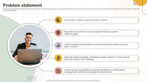 This slide presents the issues faced in health care ecosystem. It mentions problems such as requirement of effective treatment, requirement of vaccinations, limited availability and affordability of essential medicines, and limited resources and guidance. Make sure to capture your audiences attention in your business displays with our gratis customizable Problem Statement Medical Research Organization Pitch Deck. These are great for business strategies, office conferences, capital raising or task suggestions. If you desire to acquire more customers for your tech business and ensure they stay satisfied, create your own sales presentation with these plain slides. This slide presents the issues faced in health care ecosystem. It mentions problems such as requirement of effective treatment, requirement of vaccinations, limited availability and affordability of essential medicines, and limited resources and guidance.