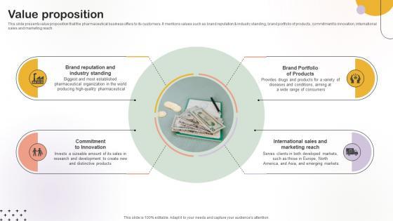 This slide presents value proposition that the pharmaceutical business offers to its customers. It mentions values such as brand reputation and industry standing, brand portfolio of products, commitment to innovation, international sales and marketing reach.Welcome to our selection of the Value Proposition Medical Research Organization Pitch Deck. These are designed to help you showcase your creativity and bring your sphere to life. Planning and Innovation are essential for any business that is just starting out. This collection contains the designs that you need for your everyday presentations. All of our PowerPoints are 100 percent editable, so you can customize them to suit your needs. This multi-purpose template can be used in various situations. Grab these presentation templates today. This slide presents value proposition that the pharmaceutical business offers to its customers. It mentions values such as brand reputation and industry standing, brand portfolio of products, commitment to innovation, international sales and marketing reach.
