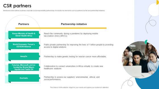 Mentioned slide outlines business corporate social responsibility partnerships. It includes key elements such as partners names and partnership initiatives. Present like a pro with Csr Partners Medical Research And Development Company Profile CP SS V. Create beautiful presentations together with your team, using our easy-to-use presentation slides. Share your ideas in real-time and make changes on the fly by downloading our templates. So whether you are in the office, on the go, or in a remote location, you can stay in sync with your team and present your ideas with confidence. With Slidegeeks presentation got a whole lot easier. Grab these presentations today. Mentioned slide outlines business corporate social responsibility partnerships. It includes key elements such as partners names and partnership initiatives.