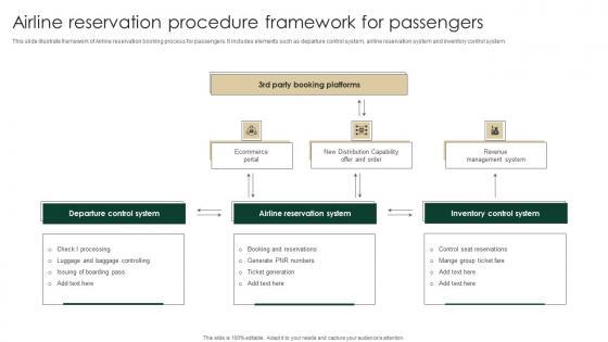 This slide illustrate framework of Airline reservation booking process for passengers. It includes elements such as departure control system, airline reservation system and inventory control system. Showcasing this set of slides titled Airline Reservation Procedure Framework For Passengers Elements Pdf. The topics addressed in these templates are Departure Control System, Airline Reservation System, Inventory Control System. All the content presented in this PPT design is completely editable. Download it and make adjustments in color, background, font etc. as per your unique business setting. This slide illustrate framework of Airline reservation booking process for passengers. It includes elements such as departure control system, airline reservation system and inventory control system.