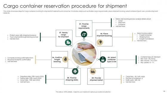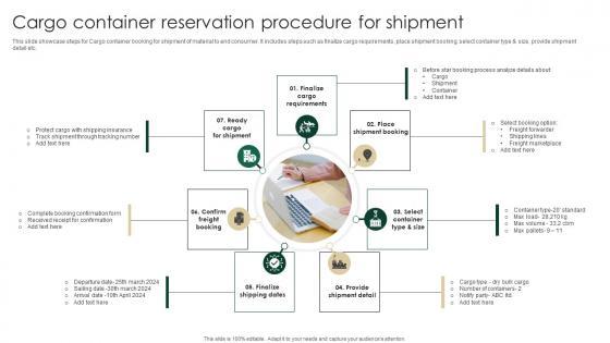 This slide showcase steps for Cargo container booking for shipment of material to end consumer. It includes steps such as finalize cargo requirements, place shipment booking, select container type and size, provide shipment detail etc. Pitch your topic with ease and precision using this Cargo Container Reservation Procedure For Shipment Download Pdf. This layout presents information on Finalize Cargo Requirements, Place Shipment Booking, Finalize Shipping Dates. It is also available for immediate download and adjustment. So, changes can be made in the color, design, graphics or any other component to create a unique layout. This slide showcase steps for Cargo container booking for shipment of material to end consumer. It includes steps such as finalize cargo requirements, place shipment booking, select container type and size, provide shipment detail etc.