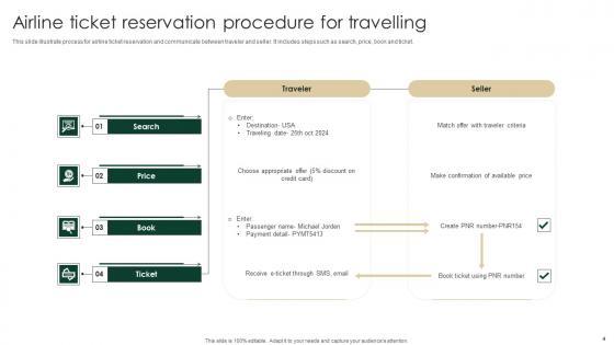 This slide illustrate process for airline ticket reservation and communicate between traveler and seller. It includes steps such as search, price, book and ticket. Pitch your topic with ease and precision using this Airline Ticket Reservation Procedure For Travelling Ideas Pdf. This layout presents information on Airline Ticket Reservation, Procedure For Travelling, Communicate. It is also available for immediate download and adjustment. So, changes can be made in the color, design, graphics or any other component to create a unique layout. This slide illustrate process for airline ticket reservation and communicate between traveler and seller. It includes steps such as search, price, book and ticket.
