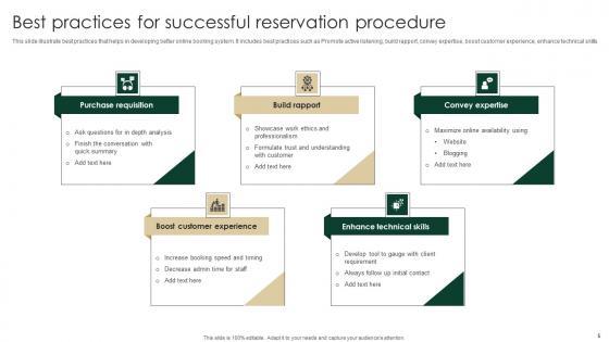 This slide illustrate best practices that helps in developing better online booking system. It includes best practices such as Promote active listening, build rapport, convey expertise, boost customer experience, enhance technical skills. Showcasing this set of slides titled Best Practices For Successful Reservation Procedure Pictures Pdf. The topics addressed in these templates are Purchase Requisition, Boost Customer Experience, Enhance Technical Skills, Convey Expertise. All the content presented in this PPT design is completely editable. Download it and make adjustments in color, background, font etc. as per your unique business setting. This slide illustrate best practices that helps in developing better online booking system. It includes best practices such as Promote active listening, build rapport, convey expertise, boost customer experience, enhance technical skills.