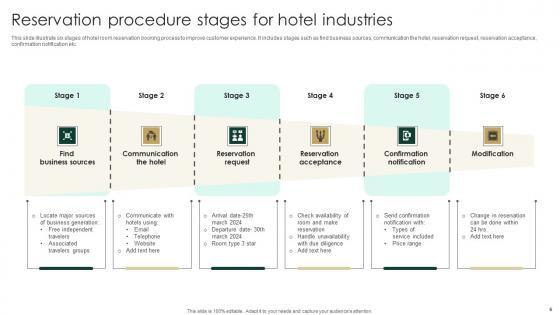 This slide illustrate six stages of hotel room reservation booking process to improve customer experience. It includes stages such as find business sources, communication the hotel, reservation request, reservation acceptance, confirmation notification etc. Showcasing this set of slides titled Reservation Procedure Stages For Hotel Industries Guidelines Pdf. The topics addressed in these templates are Reservation Request, Reservation Acceptance, Confirmation Notification. All the content presented in this PPT design is completely editable. Download it and make adjustments in color, background, font etc. as per your unique business setting. This slide illustrate six stages of hotel room reservation booking process to improve customer experience. It includes stages such as find business sources, communication the hotel, reservation request, reservation acceptance, confirmation notification etc.