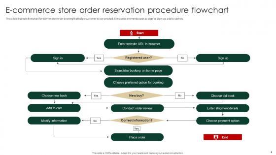 This slide illustrate flowchart for ecommerce order booking that helps customer to buy product. It includes elements such as sign-in, sign-up, add to cart etc. Showcasing this set of slides titled E Commerce Store Order Reservation Procedure Flowchart Mockup Pdf. The topics addressed in these templates are E Commerce Store Order, Reservation Procedure Flowchart, Customer To Buy Product. All the content presented in this PPT design is completely editable. Download it and make adjustments in color, background, font etc. as per your unique business setting. This slide illustrate flowchart for ecommerce order booking that helps customer to buy product. It includes elements such as sign-in, sign-up, add to cart etc.