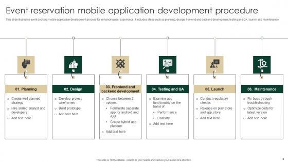 This slide illustrates event booking mobile application development process for enhancing user experience. It includes steps such as planning, design, frontend and backend development, testing and QA, launch and maintenance. Pitch your topic with ease and precision using this Event Reservation Mobile Application Development Procedure Formats Pdf. This layout presents information on Event Reservation, Mobile Application, Development Procedure. It is also available for immediate download and adjustment. So, changes can be made in the color, design, graphics or any other component to create a unique layout. This slide illustrates event booking mobile application development process for enhancing user experience. It includes steps such as planning, design, frontend and backend development, testing and QA, launch and maintenance.