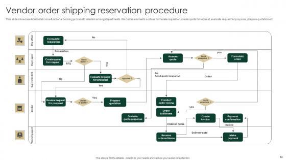 This slide showcase horizontal cross-functional booking process to interlink among departments. It includes elements such as formulate requisition, create quote for request, evaluate request for proposal, prepare quotation etc. Showcasing this set of slides titled Vendor Order Shipping Reservation Procedure Portrait Pdf. The topics addressed in these templates are Vendor Order Shipping, Reservation Procedure, Horizontal Cross Functional Booking. All the content presented in this PPT design is completely editable. Download it and make adjustments in color, background, font etc. as per your unique business setting. This slide showcase horizontal cross-functional booking process to interlink among departments. It includes elements such as formulate requisition, create quote for request, evaluate request for proposal, prepare quotation etc.