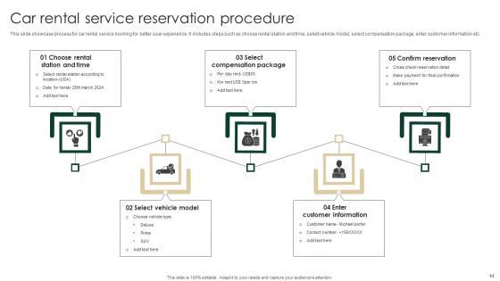 This slide showcase process for car rental service booking for better user experience. It includes steps such as choose rental station and time, select vehicle model, select compensation package, enter customer information etc. Showcasing this set of slides titled Car Rental Service Reservation Procedure Mockup Pdf. The topics addressed in these templates are Enter Customer Information, Confirm Reservation, Select Compensation Package. All the content presented in this PPT design is completely editable. Download it and make adjustments in color, background, font etc. as per your unique business setting. This slide showcase process for car rental service booking for better user experience. It includes steps such as choose rental station and time, select vehicle model, select compensation package, enter customer information etc.