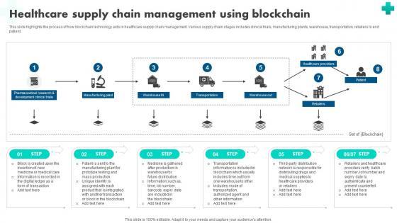 This slide highlights the process of how blockchain technology aids in healthcare supply chain management. Various supply chain stages includes clinical trials, manufacturing plants, warehouse, transportation, retailers to end patient. Explore a selection of the finest How Blockchain Is Reshaping Healthcare Supply Chain Management BCT SS V here. With a plethora of professionally designed and pre-made slide templates, you can quickly and easily find the right one for your upcoming presentation. You can use our How Blockchain Is Reshaping Healthcare Supply Chain Management BCT SS V to effectively convey your message to a wider audience. Slidegeeks has done a lot of research before preparing these presentation templates. The content can be personalized and the slides are highly editable. Grab templates today from Slidegeeks. This slide highlights the process of how blockchain technology aids in healthcare supply chain management. Various supply chain stages includes clinical trials, manufacturing plants, warehouse, transportation, retailers to end patient.