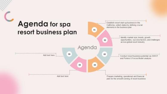 Find a pre-designed and impeccable Agenda For Spa Resort Business Plan BP SS V. The templates can ace your presentation without additional effort. You can download these easy-to-edit presentation templates to make your presentation stand out from others. So, what are you waiting for Download the template from Slidegeeks today and give a unique touch to your presentation. Our Agenda For Spa Resort Business Plan BP SS V are topically designed to provide an attractive backdrop to any subject. Use them to look like a presentation pro.