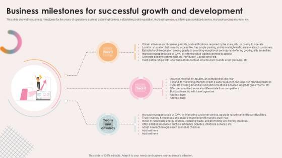 This slide shows the business milestones for five years of operations such as obtaining licenses, establishing solid reputation, increasing revenue, offering personalized service, increasing occupancy rate, etc. Do you have to make sure that everyone on your team knows about any specific topic I yes, then you should give Spa Resort Business Plan Business Milestones For Successful Growth And Development BP SS V a try. Our experts have put a lot of knowledge and effort into creating this impeccable Spa Resort Business Plan Business Milestones For Successful Growth And Development BP SS V. You can use this template for your upcoming presentations, as the slides are perfect to represent even the tiniest detail. You can download these templates from the Slidegeeks website and these are easy to edit. So grab these today This slide shows the business milestones for five years of operations such as obtaining licenses, establishing solid reputation, increasing revenue, offering personalized service, increasing occupancy rate, etc.