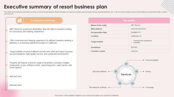 This slide showcases the executive summary of resort business plan, which includes a company summary such as target market, property features, etc. It also includes entities such as web address, incorporation date, location, services, etc. Whether you have daily or monthly meetings, a brilliant presentation is necessary. Spa Resort Business Plan Executive Summary Of Resort Business Plan BP SS V can be your best option for delivering a presentation. Represent everything in detail using Spa Resort Business Plan Executive Summary Of Resort Business Plan BP SS V and make yourself stand out in meetings. The template is versatile and follows a structure that will cater to your requirements. All the templates prepared by Slidegeeks are easy to download and edit. Our research experts have taken care of the corporate themes as well. So, give it a try and see the results. This slide showcases the executive summary of resort business plan, which includes a company summary such as target market, property features, etc. It also includes entities such as web address, incorporation date, location, services, etc.