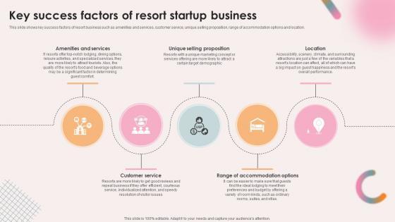 This slide shows key success factors of resort business such as amenities and services, customer service, unique selling proposition, range of accommodation options and location. Create an editable Key Success Factors Of Resort Startup Business Spa Resort Business Plan BP SS V that communicates your idea and engages your audience. Whether you are presenting a business or an educational presentation, pre-designed presentation templates help save time. Key Success Factors Of Resort Startup Business Spa Resort Business Plan BP SS V is highly customizable and very easy to edit, covering many different styles from creative to business presentations. Slidegeeks has creative team members who have crafted amazing templates. So, go and get them without any delay. This slide shows key success factors of resort business such as amenities and services, customer service, unique selling proposition, range of accommodation options and location.