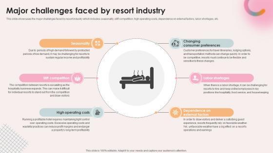 This slide showcases the major challenges faced by resort industry which includes seasonality, stiff competition, high operating costs, dependence on external factors, labor shortages, etc. Formulating a presentation can take up a lot of effort and time, so the content and message should always be the primary focus. The visuals of the PowerPoint can enhance the presenters message, so our Spa Resort Business Plan Major Challenges Faced By Resort Industry BP SS V was created to help save time. Instead of worrying about the design, the presenter can concentrate on the message while our designers work on creating the ideal templates for whatever situation is needed. Slidegeeks has experts for everything from amazing designs to valuable content, we have put everything into Spa Resort Business Plan Major Challenges Faced By Resort Industry BP SS V. This slide showcases the major challenges faced by resort industry which includes seasonality, stiff competition, high operating costs, dependence on external factors, labor shortages, etc.