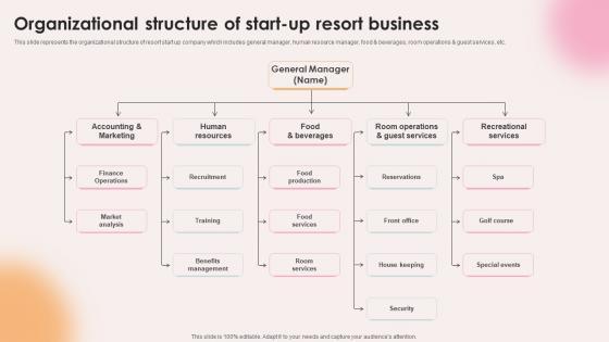 This slide represents the organizational structure of resort start up company which includes general manager, human resource manager, food and beverages, room operations and guest services, etc. Welcome to our selection of the Spa Resort Business Plan Organizational Structure Of Start Up Resort Business BP SS V. These are designed to help you showcase your creativity and bring your sphere to life. Planning and Innovation are essential for any business that is just starting out. This collection contains the designs that you need for your everyday presentations. All of our PowerPoints are 100Percent editable, so you can customize them to suit your needs. This multi-purpose template can be used in various situations. Grab these presentation templates today. This slide represents the organizational structure of resort start up company which includes general manager, human resource manager, food and beverages, room operations and guest services, etc.