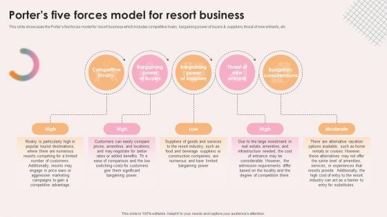This slide showcases the Porters five forces model for resort business which includes competitive rivalry, bargaining power of buyers and suppliers, threat of new entrants, etc. Explore a selection of the finest Spa Resort Business Plan Porters Five Forces Model For Resort Business BP SS V here. With a plethora of professionally designed and pre-made slide templates, you can quickly and easily find the right one for your upcoming presentation. You can use our Spa Resort Business Plan Porters Five Forces Model For Resort Business BP SS V to effectively convey your message to a wider audience. Slidegeeks has done a lot of research before preparing these presentation templates. The content can be personalized and the slides are highly editable. Grab templates today from Slidegeeks. This slide showcases the Porters five forces model for resort business which includes competitive rivalry, bargaining power of buyers and suppliers, threat of new entrants, etc