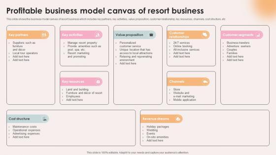 This slide shows the business model canvas of resort business which includes key partners, key activities, value proposition, customer relationship, key resources, channels, cost structure, etc. Retrieve professionally designed Spa Resort Business Plan Profitable Business Model Canvas Of Resort Business BP SS V to effectively convey your message and captivate your listeners. Save time by selecting pre-made slideshows that are appropriate for various topics, from business to educational purposes. These themes come in many different styles, from creative to corporate, and all of them are easily adjustable and can be edited quickly. Access them as PowerPoint templates or as Google Slides themes. You do not have to go on a hunt for the perfect presentation because Slidegeeks got you covered from everywhere. This slide shows the business model canvas of resort business which includes key partners, key activities, value proposition, customer relationship, key resources, channels, cost structure, etc.