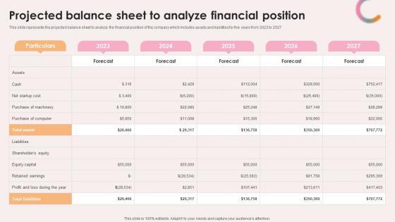 This slide represents the projected balance sheet to analyze the financial position of the company which includes assets and liabilities for five years from 2023 to 2027.Slidegeeks has constructed Spa Resort Business Plan Projected Balance Sheet To Analyze Financial Position BP SS V after conducting extensive research and examination. These presentation templates are constantly being generated and modified based on user preferences and critiques from editors. Here, you will find the most attractive templates for a range of purposes while taking into account ratings and remarks from users regarding the content. This is an excellent jumping-off point to explore our content and will give new users an insight into our top-notch PowerPoint Templates. This slide represents the projected balance sheet to analyze the financial position of the company which includes assets and liabilities for five years from 2023 to 2027.