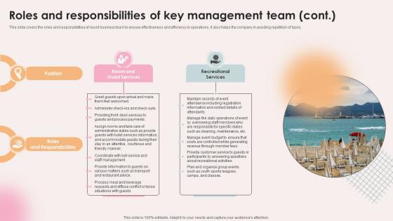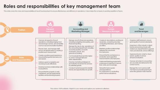 This slide covers the roles and responsibilities of resort business team to ensure effectiveness and efficiency in operations. It also helps the company in avoiding repetition of tasks. Take your projects to the next level with our ultimate collection of Spa Resort Business Plan Roles And Responsibilities Of Key Management Team BP SS V. Slidegeeks has designed a range of layouts that are perfect for representing task or activity duration, keeping track of all your deadlines at a glance. Tailor these designs to your exact needs and give them a truly corporate look with your own brand colors they will make your projects stand out from the rest This slide covers the roles and responsibilities of resort business team to ensure effectiveness and efficiency in operations. It also helps the company in avoiding repetition of tasks.