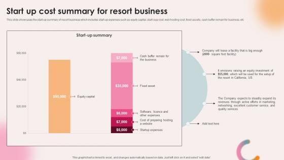 This slide showcases the start-up summary of resort business which includes start-up expenses such as equity capital, start-sup cost, web hosting cost, fixed assets, cash buffer remain for business, etc. Boost your pitch with our creative Spa Resort Business Plan Start Up Cost Summary For Resort Business BP SS V. Deliver an awe-inspiring pitch that will mesmerize everyone. Using these presentation templates you will surely catch everyones attention. You can browse the ppts collection on our website. We have researchers who are experts at creating the right content for the templates. So you do not have to invest time in any additional work. Just grab the template now and use them. This slide showcases the start-up summary of resort business which includes start-up expenses such as equity capital, start-sup cost, web hosting cost, fixed assets, cash buffer remain for business, etc.