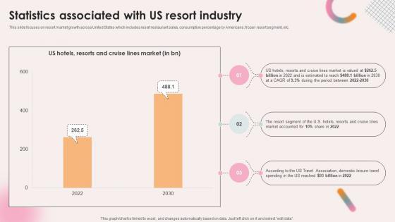 This slide focuses on resort market growth across United States which includes resort restaurant sales, consumption percentage by Americans, frozen resort segment, etc. Create an editable Spa Resort Business Plan Statistics Associated With Us Resort Industry BP SS V that communicates your idea and engages your audience. Whether you are presenting a business or an educational presentation, pre-designed presentation templates help save time. Spa Resort Business Plan Statistics Associated With Us Resort Industry BP SS V is highly customizable and very easy to edit, covering many different styles from creative to business presentations. Slidegeeks has creative team members who have crafted amazing templates. So, go and get them without any delay. This slide focuses on resort market growth across United States which includes resort restaurant sales, consumption percentage by Americans, frozen resort segment, etc.