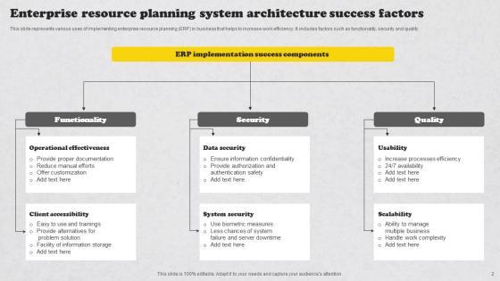 This slide represents various uses of implementing enterprise resource planning ERP in business that helps to increase work efficiency. It includes factors such as functionality, security and quality Showcasing this set of slides titled Enterprise Resource Planning System Architecture Success Factors Background Pdf. The topics addressed in these templates are Quality, Security, Functionality. All the content presented in this PPT design is completely editable. Download it and make adjustments in color, background, font etc. as per your unique business setting. This slide represents various uses of implementing enterprise resource planning ERP in business that helps to increase work efficiency. It includes factors such as functionality, security and quality
