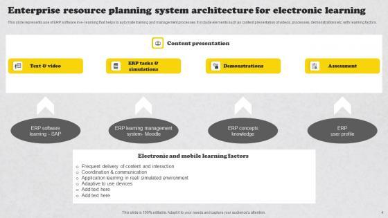 This slide represents use of ERP software in e- learning that helps to automate training and management processes. It include elements such as content presentation of videos, processes, demonstrations etc. with learning factors. Pitch your topic with ease and precision using this Enterprise Resource Planning System Architecture For Electronic Learning Infographics Pdf. This layout presents information on Communication, Erp Learning Management, Simulated Environment. It is also available for immediate download and adjustment. So, changes can be made in the color, design, graphics or any other component to create a unique layout. This slide represents use of ERP software in e- learning that helps to automate training and management processes. It include elements such as content presentation of videos, processes, demonstrations etc. with learning factors.