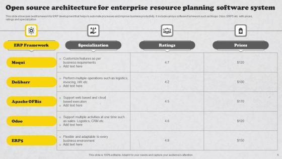This slide showcase best framework for ERP development that helps to automate processes and improve business productivity. It include various software framework such as Moqui. Odoo, ERP5 etc. with prices, ratings and specialization Showcasing this set of slides titled Open Source Architecture For Enterprise Resource Planning Software System Portrait Pdf. The topics addressed in these templates are Business Requirements, Execution, Prices. All the content presented in this PPT design is completely editable. Download it and make adjustments in color, background, font etc. as per your unique business setting. This slide showcase best framework for ERP development that helps to automate processes and improve business productivity. It include various software framework such as Moqui. Odoo, ERP5 etc. with prices, ratings and specialization