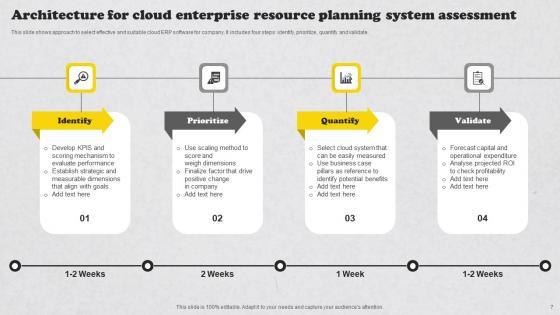 This slide shows approach to select effective and suitable cloud ERP software for company. It includes four steps identify, prioritize, quantify and validate. Showcasing this set of slides titled Architecture For Cloud Enterprise Resource Planning System Assessment Brochure Pdf. The topics addressed in these templates are Identify, Prioritize, Quantify. All the content presented in this PPT design is completely editable. Download it and make adjustments in color, background, font etc. as per your unique business setting. This slide shows approach to select effective and suitable cloud ERP software for company. It includes four steps identify, prioritize, quantify and validate.