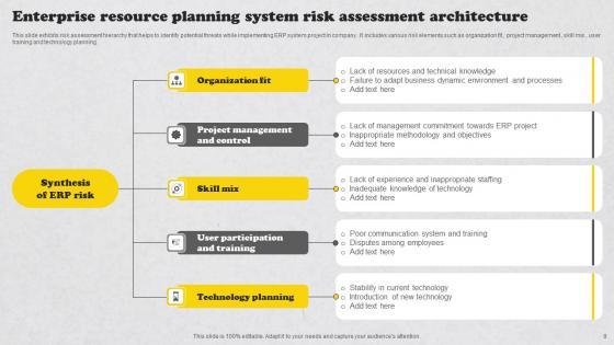 This slide exhibits risk assessment hierarchy that helps to identify potential threats while implementing ERP system project in company . It includes various risk elements such as organization fit , project management , skill mix , user training and technology planning. Pitch your topic with ease and precision using this Enterprise Resource Planning System Risk Assessment Architecture Introduction Pdf. This layout presents information on Organization Fit, Technology Planning, Skill Mix. It is also available for immediate download and adjustment. So, changes can be made in the color, design, graphics or any other component to create a unique layout. This slide exhibits risk assessment hierarchy that helps to identify potential threats while implementing ERP system project in company . It includes various risk elements such as organization fit , project management , skill mix , user training and technology planning.