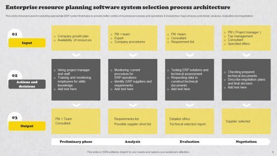 This slide shows process for selecting appropriate ERP system that helps to provide better control of business processes and operations. It include four major phases preliminary, analysis, evaluation and negotiation. Showcasing this set of slides titled Enterprise Resource Planning Software System Selection Process Architecture Designs Pdf. The topics addressed in these templates are Company Growth Plan, Availability Of Resources, Requirement List. All the content presented in this PPT design is completely editable. Download it and make adjustments in color, background, font etc. as per your unique business setting. This slide shows process for selecting appropriate ERP system that helps to provide better control of business processes and operations. It include four major phases preliminary, analysis, evaluation and negotiation.