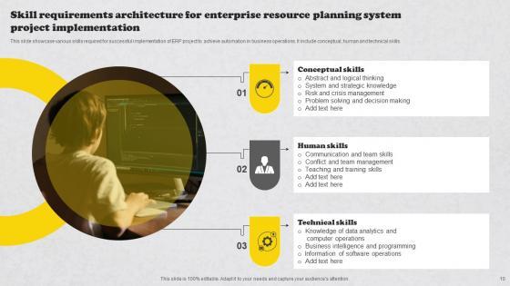 This slide showcase various skills required for successful implementation of ERP project to achieve automation in business operations. It include conceptual, human and technical skills. Pitch your topic with ease and precision using this Skill Requirements Architecture For Enterprise Resource Planning System Project Implementation Graphics Pdf.q This layout presents information on Conceptual Skills, Human Skills, Technical Skills. It is also available for immediate download and adjustment. So, changes can be made in the color, design, graphics or any other component to create a unique layout. This slide showcase various skills required for successful implementation of ERP project to achieve automation in business operations. It include conceptual, human and technical skills.