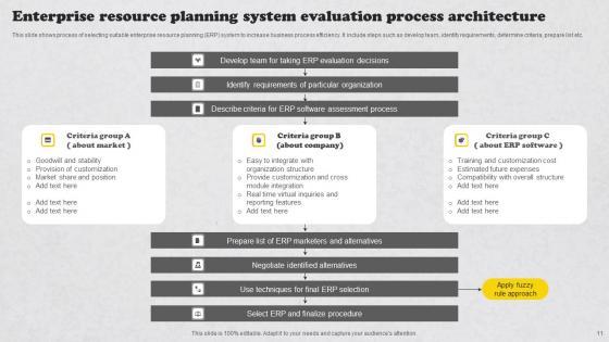 This slide shows process of selecting suitable enterprise resource planning ERP system to increase business process efficiency. It include steps such as develop team, identify requirements, determine criteria, prepare list etc. Pitch your topic with ease and precision using this Enterprise Resource Planning System Evaluation Process Architecture Professional Pdf. This layout presents information on Market Share And Position, Provision Of Customization, Goodwill And Stability. It is also available for immediate download and adjustment. So, changes can be made in the color, design, graphics or any other component to create a unique layout. This slide shows process of selecting suitable enterprise resource planning ERP system to increase business process efficiency. It include steps such as develop team, identify requirements, determine criteria, prepare list etc.