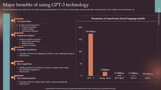 This slide showcases major benefits users can achieve through proper utilization of GPT 3 tools. It provides details about text generation, sentiment analysis, text completion, text summarization, etc. The Comprehensive Resource Guide To Master GPT 3 Major Benefits Of Using GPT 3 Technology Microsoft PDF is a compilation of the most recent design trends as a series of slides. It is suitable for any subject or industry presentation, containing attractive visuals and photo spots for businesses to clearly express their messages. This template contains a variety of slides for the user to input data, such as structures to contrast two elements, bullet points, and slides for written information. Slidegeeks is prepared to create an impression.