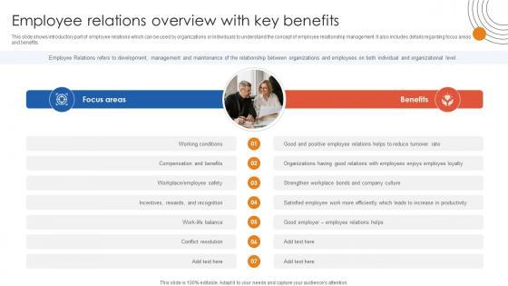 This slide shows introductory part of employee relations which can be used by organizations or individuals to understand the concept of employee relationship management. It also includes details regarding focus areas and benefits. If your project calls for a presentation, then Slidegeeks is your go-to partner because we have professionally designed, easy-to-edit templates that are perfect for any presentation. After downloading, you can easily edit Employee Relations In Human Resource Employee Relations Overview With Key Benefits and make the changes accordingly. You can rearrange slides or fill them with different images. Check out all the handy templates This slide shows introductory part of employee relations which can be used by organizations or individuals to understand the concept of employee relationship management. It also includes details regarding focus areas and benefits.