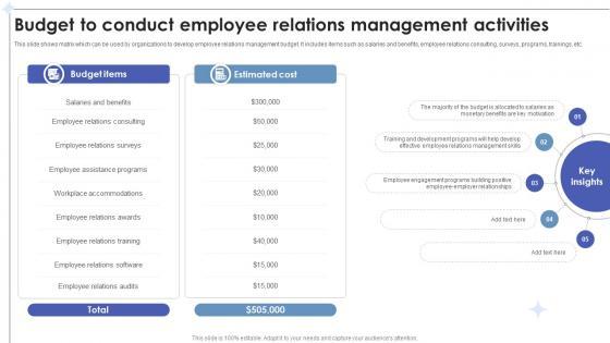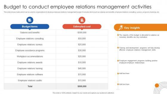 This slide shows matrix which can be used by organizations to develop employee relations management budget. It includes items such as salaries and benefits, employee relations consulting, surveys, programs, trainings, etc. Do you have to make sure that everyone on your team knows about any specific topic I yes, then you should give Human Resource Industrial Relationship Budget To Conduct Employee Relations Management Activities a try. Our experts have put a lot of knowledge and effort into creating this impeccable Human Resource Industrial Relationship Budget To Conduct Employee Relations Management Activities. You can use this template for your upcoming presentations, as the slides are perfect to represent even the tiniest detail. You can download these templates from the Slidegeeks website and these are easy to edit. So grab these today This slide shows matrix which can be used by organizations to develop employee relations management budget. It includes items such as salaries and benefits, employee relations consulting, surveys, programs, trainings, etc.