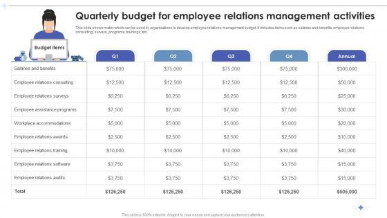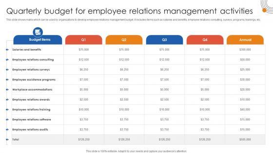 This slide shows matrix which can be used by organizations to develop employee relations management budget. It includes items such as salaries and benefits, employee relations consulting, surveys, programs, trainings, etc. Slidegeeks has constructed Employee Relations In Human Resource Quarterly Budget For Employee Relations Management after conducting extensive research and examination. These presentation templates are constantly being generated and modified based on user preferences and critiques from editors. Here, you will find the most attractive templates for a range of purposes while taking into account ratings and remarks from users regarding the content. This is an excellent jumping-off point to explore our content and will give new users an insight into our top-notch PowerPoint Templates. This slide shows matrix which can be used by organizations to develop employee relations management budget. It includes items such as salaries and benefits, employee relations consulting, surveys, programs, trainings, etc.