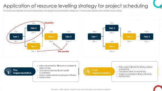 This slide presents application of resource levelling strategy, that highlights how project schedule is affected by it. It includes project operation before and after resource levelling. Boost your pitch with our creative Application Of Resource Levelling Schedule Management Techniques PPT Presentation. Deliver an awe-inspiring pitch that will mesmerize everyone. Using these presentation templates you will surely catch everyones attention. You can browse the ppts collection on our website. We have researchers who are experts at creating the right content for the templates. So you do not have to invest time in any additional work. Just grab the template now and use them. This slide presents application of resource levelling strategy, that highlights how project schedule is affected by it. It includes project operation before and after resource levelling.